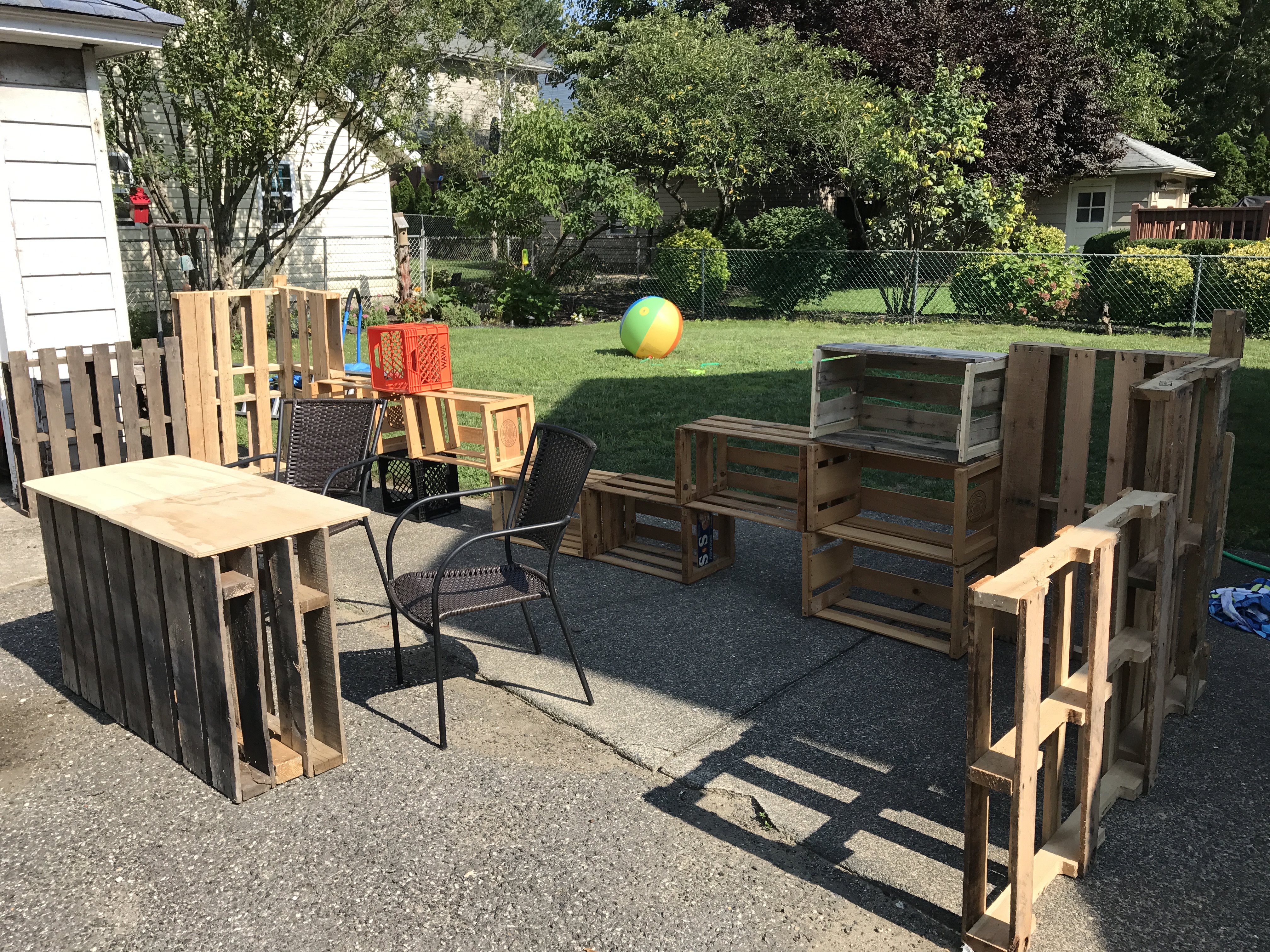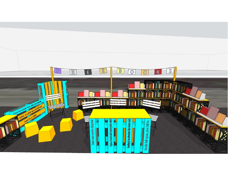 The park was primarily created with wood pallets and plastic crates, which would make the border and hold all of the books. We wanted to make our space look like an outdoor reading room, so we also used chairs and outdoor rugs along with making a table out of pallet wood. All of the pallet wood fencing was painted to resemble books on a bookshelf, complete with famous titles and pictures. The banner was made with cutout letters on cardstock clipped to a jute string spanning the length of the park overhead.