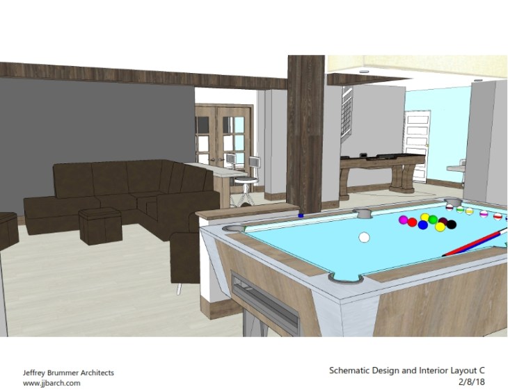 Additional spaces like a visitor bedroom with bunk beds to create a family suite, a bathroom with a full shower, and utility spaces complete the design. We maintained the connections to the outdoor patio through the open game space, so the outside patio can be used as an extension of the entertainment rooms inside. We are excited to see this basement transformation take place. By using the combination of 2D space planning and 3D rendering, we were able to help the owners realize the best way to use their underutilized space.