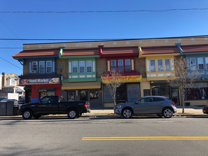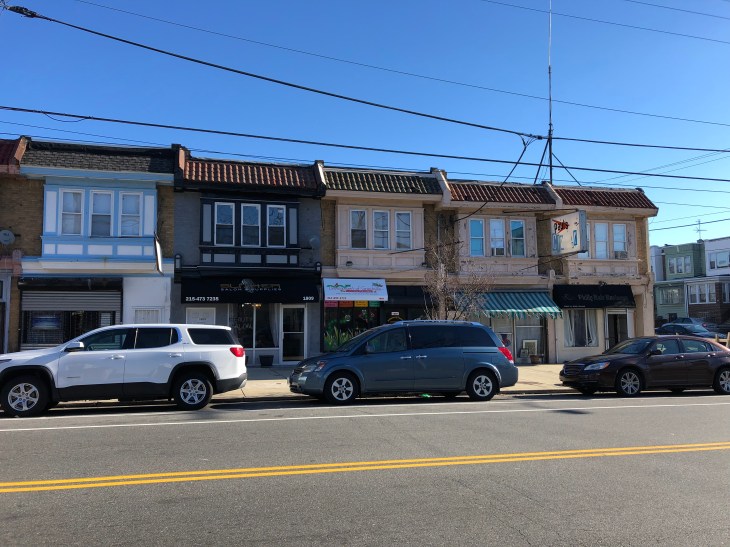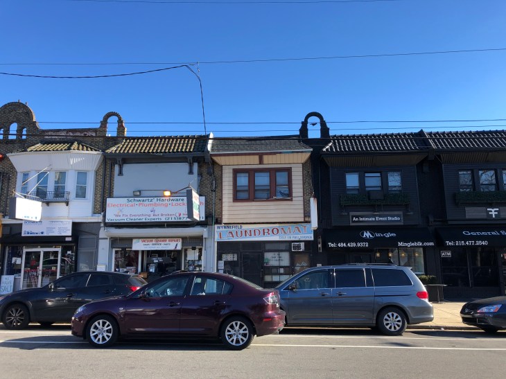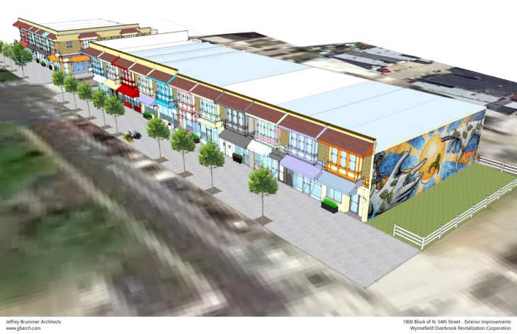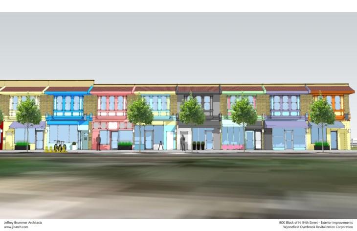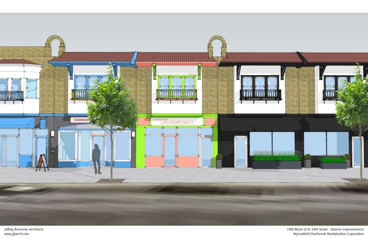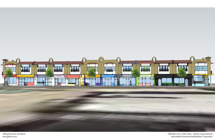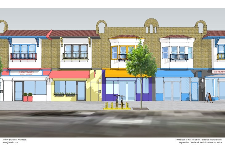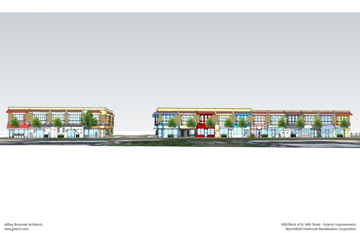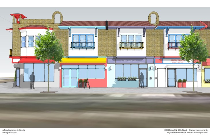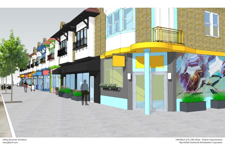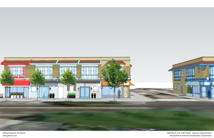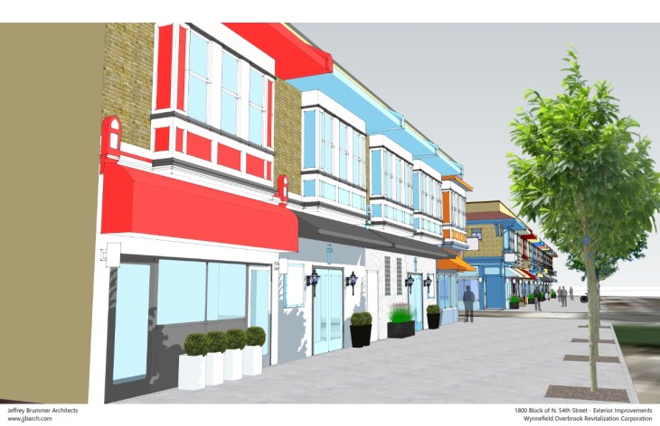 We collaborated with the Wynnefield Overbrook Revitalization Corporation to develop a series of commercial facade improvements for an existing commercial corridor on the 1800 and 1900 blocks of North 54th Street in Philadelphia. Buildings on both of the blocks have intricate detailing on not only the storefronts, but also on the window bays and cornices. One goal of our design is to highlight those details by using color to make the brackets and cornices stand out. A set of three signage standards is used to provide a more unified look along both blocks while providing variety among the different businesses. Hanging signs, painted awnings and window lettering, and wall signs provide the variety that allows businesses to be recognized without the signage overpowering the buildings.
