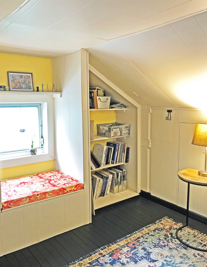 For this home office renovation, we focused on color and materials to enliven the existing attic. The length of the attic created two distinct zones, the office and the lounge. Features of the office are abundant shelving contoured to the existing roof angles painted with a colorful backdrop to accent the window wall. A fabric seating area has storage beneath and is placed under the window for views to the back yard. A custom fabricated standing desk with a cherry top was created by The Factory Workers, a local craftsman, to exact height specifications.