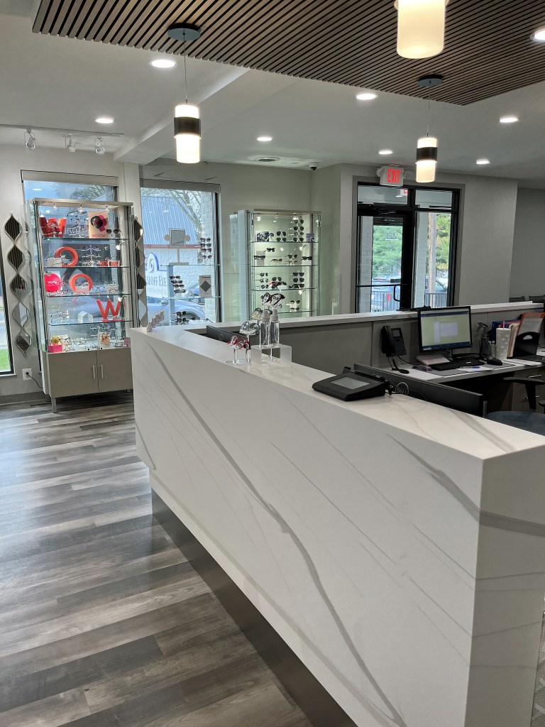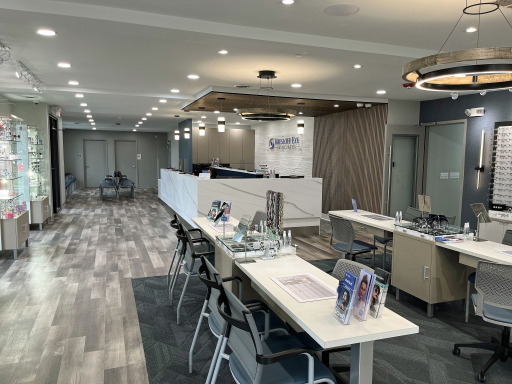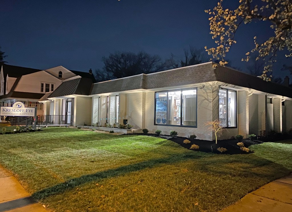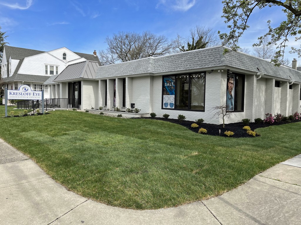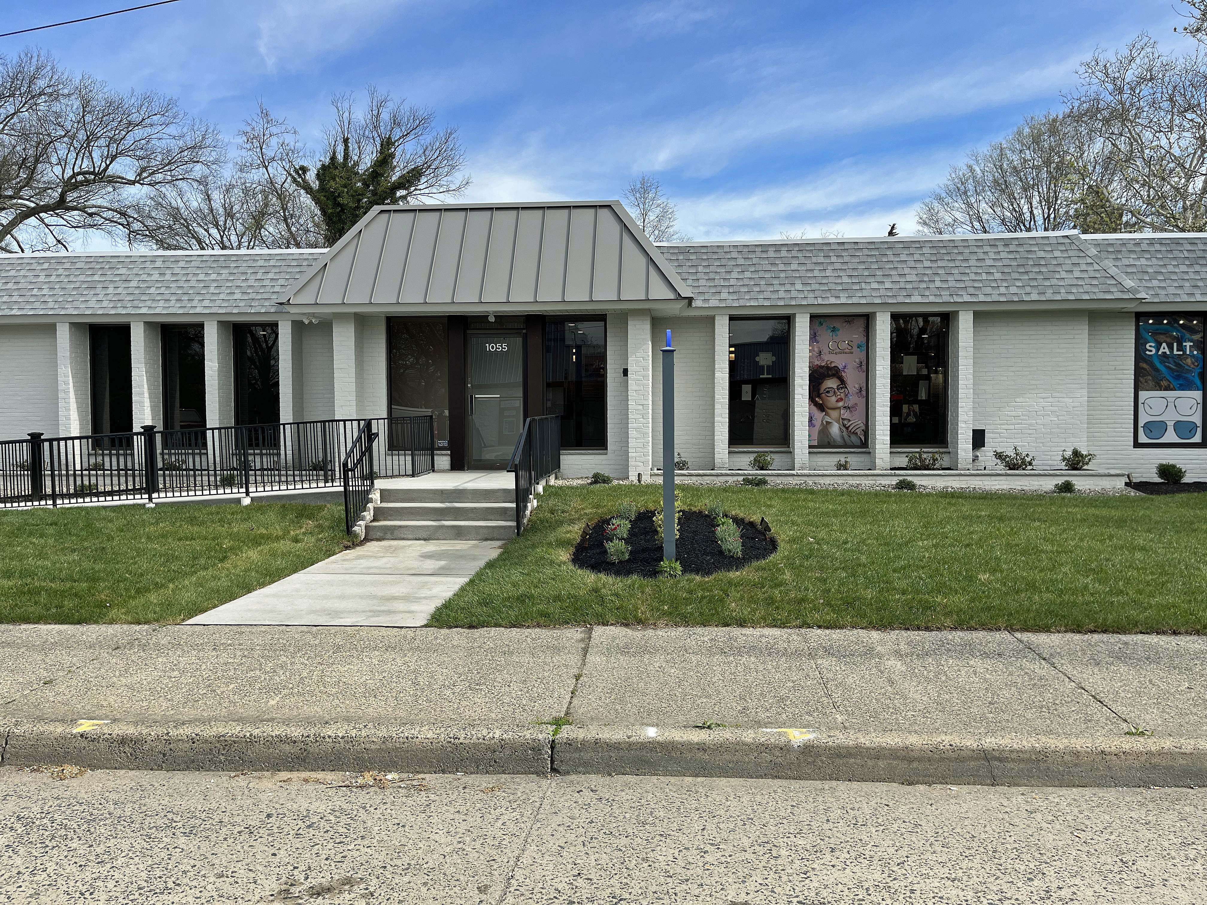 We designed the Kresloff Eye Associates building to accommodate the relocation of their long-standing practice from an office suite into a stand-alone building. The move provides increased visibility along the busy Haddon Avenue commercial corridor while adding capacity to their optical selection and services. Working closely with Dr. Kresloff, we fine tuned the patient flow throughout the space to maximize the building without adding on to it. Ten exam rooms, multiple technical areas, support offices, optical lab, and an open lobby and optical department that spans the front of the building. Multiple additions over the course of decades left the existing interior feeling separated and disjointed, so our challenge was to open up as many of the walls (including three long bearing walls) to unify the building to the greatest extent possible. Adding exterior windows to the front and side facades not only bring in natural light, but provide the visual awareness of the optical services that are provided within. We painted the exterior brick, raised the roof over the main entrance and added metal panels, removed many overgrown plantings and trees, to open up the site and highlight the building. We are excited with the results and the fully renovated building has a light and bright feel along Haddon Avenue.