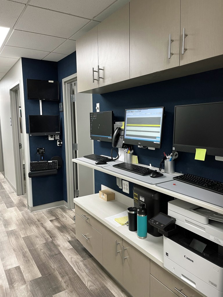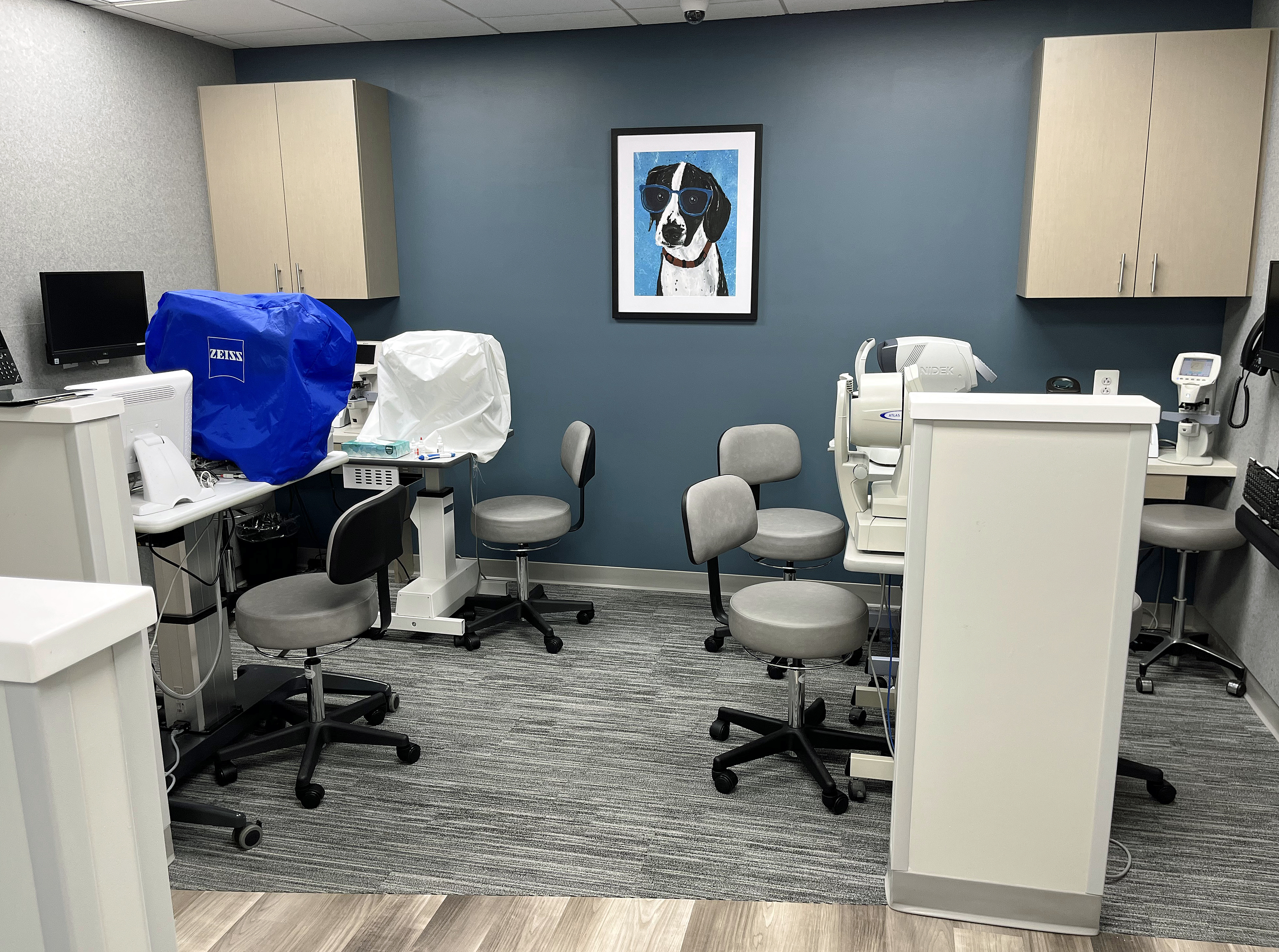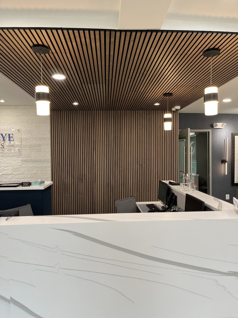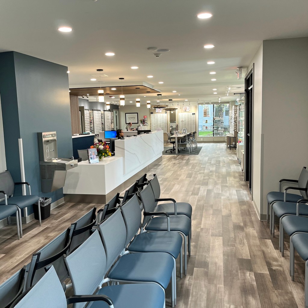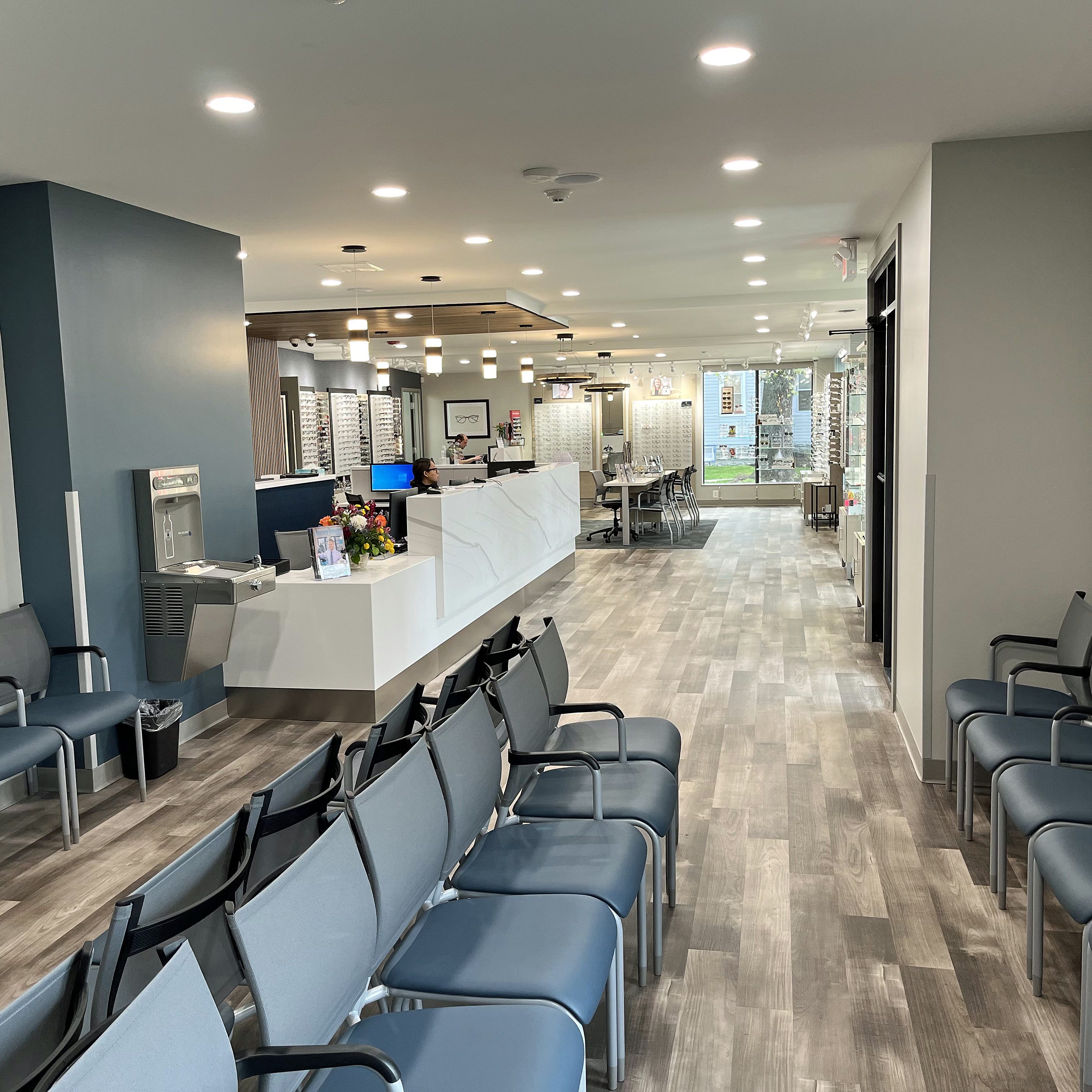 We designed the Kresloff Eye Associates building to accommodate the relocation of their long-standing practice from an office suite into a stand-alone building. The move provides increased visibility along the busy Haddon Avenue commercial corridor while adding capacity to their optical selection and services. Working closely with Dr. Kresloff, we fine tuned the patient flow throughout the space to maximize the building without adding on to it. Ten exam rooms, multiple technical areas, support offices, optical lab, and an open lobby and optical department that spans the front of the building. Multiple additions over the course of decades left the existing interior feeling separated and disjointed, so our challenge was to open up as many of the walls (including three long bearing walls) to unify the building to the greatest extent possible. Adding exterior windows to the front and side facades not only bring in natural light, but provide the visual awareness of the optical services that are provided within. We painted the exterior brick, raised the roof over the main entrance and added metal panels, removed many overgrown plantings and trees, to open up the site and highlight the building. We are excited with the results and the fully renovated building has a light and bright feel along Haddon Avenue.